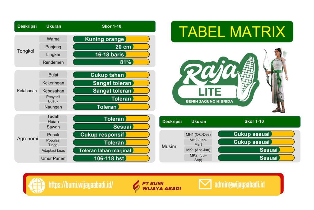 Benih Raja R7 Lite adalah bibit jagung hibrida dengan umur panen medium, biomassa dan produksi silase tinggi. Dengan rendemen > 82% dan kemampuan adaptasi yang baik terhadap lahan marjinal, benih ini sangat cocok untuk petani yang ingin meningkatkan produktivitas di kondisi tanah yang menantang. Benih ini juga sangat toleran terhadap bulai dan kondisi kekeringan.