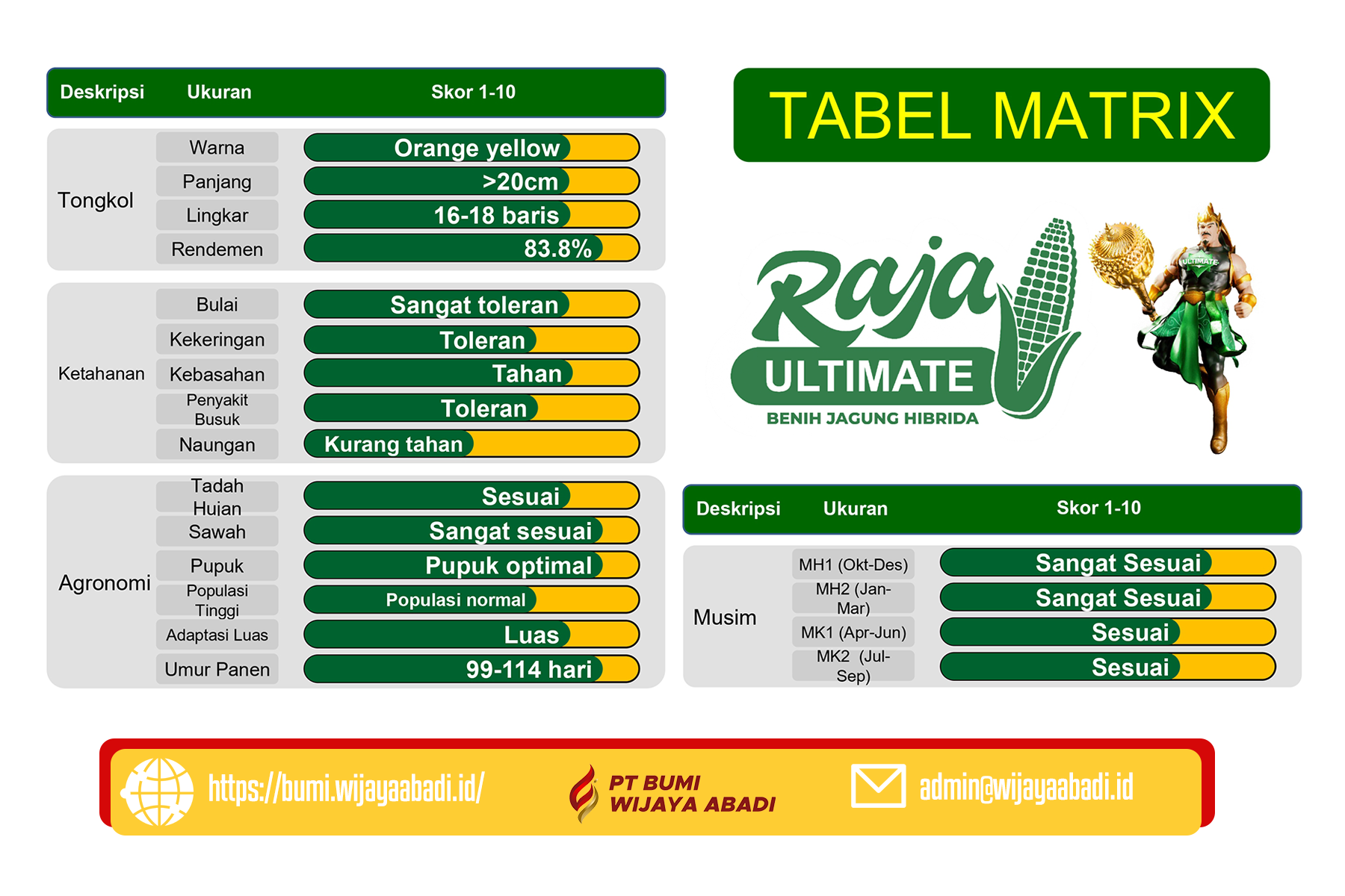 Benih Jagung Raja R7 Ultimate adalah benih jagung hibrida pilihan sempurna untuk petani yang menginginkan hasil maksimal di lahan basah. Dengan rata-rata hasil panen hingga 13,15 ton/ha dan rendemen > 82%, benih ini sangat responsif terhadap pemupukan dan memiliki batang kokoh yang tahan rebah. Warna bijinya orange yellow yang menarik, dengan pertumbuhan seragam.